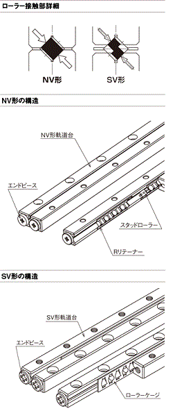 ローラーは鋼球に比べ接触面積が大きく、弾性変形量が少なくなり、更に非循環方式のため有効転動体数が多いので高剛性で高負荷容量です。またNV形は新規軌動台設計により、ローラーと軌動面の接触長さをSV形に比べ30〜58%増加させ、またローラーピッチを細かくし、ローラー数を増やしたことにより定格荷重を1.3〜2.5倍にしました。