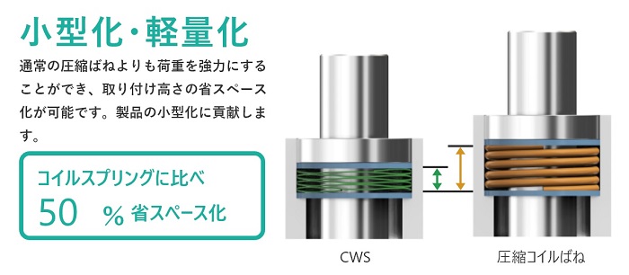 CWSとはコイルドウェーブスプリングの略称で、平線材で成形した、特に静荷重の用途に最適な圧縮ばねです。 (小さな“たわみ(ストローク)”であれば動荷重にも対応可能)