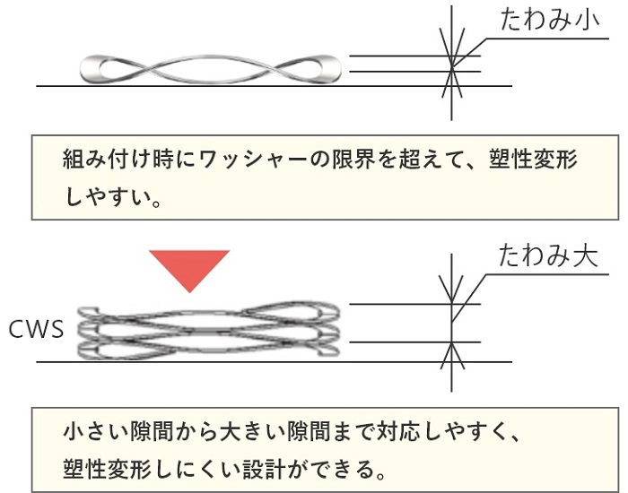 CWSはウェーブワッシャーと比べてたわみ量を大きくとれ、塑性変形(ヘタリ)のリスクを低下させることができます。
