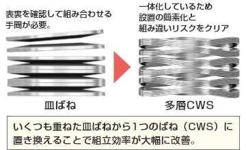 皿ばねを組合せて使用していたお客様に対して、CWSを改良し、1枚の板材を重ねて成形した多巻層CWSを開発。複数の皿ばねを1個のCWSに置き替えたことで、組付けコスト削減と組み間違いゼロを実現しました。