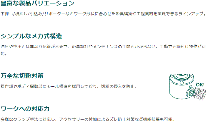 メカ式のシンプルな構造のためロボットによる操作が容易で、切削加工の現場においても、治具やワークの段取りでのロボット活用につながります。