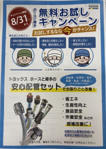 ホース、継手のメーカーのトヨックス様が8月末までの期間限定で