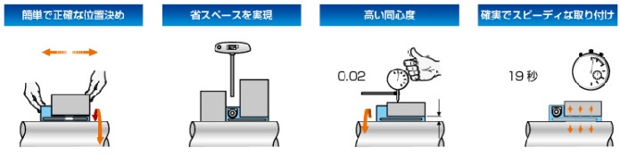 ※従来のくさび方式を利用した場合、組立時間5分程度(メーカー調べ)がボルト1本19秒で簡単装着!