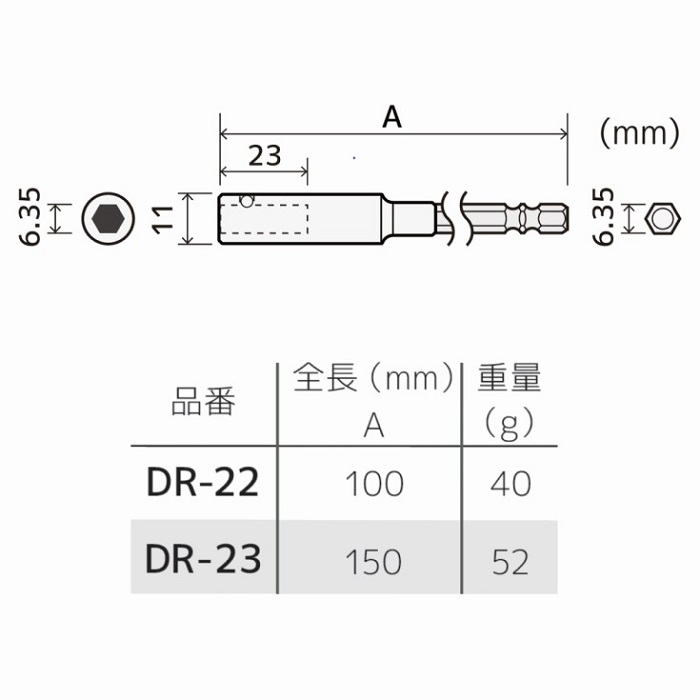 | ● 対辺6.35mmの六角軸ビットやドリルの延長に。 |